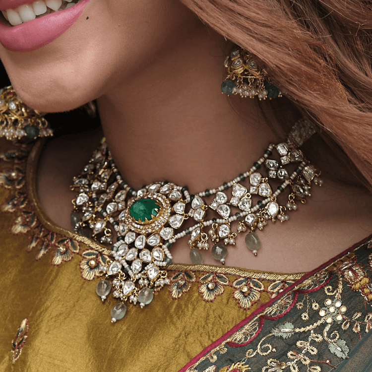 Indulge in our luxurious collection of premium necklaces, showcasing the finest craftsmanship with Kundan, Moissanite, pearls, doublet, and crystal stones. Each necklace is a masterpiece, designed to reflect elegance and sophistication, perfect for those who appreciate timeless beauty.