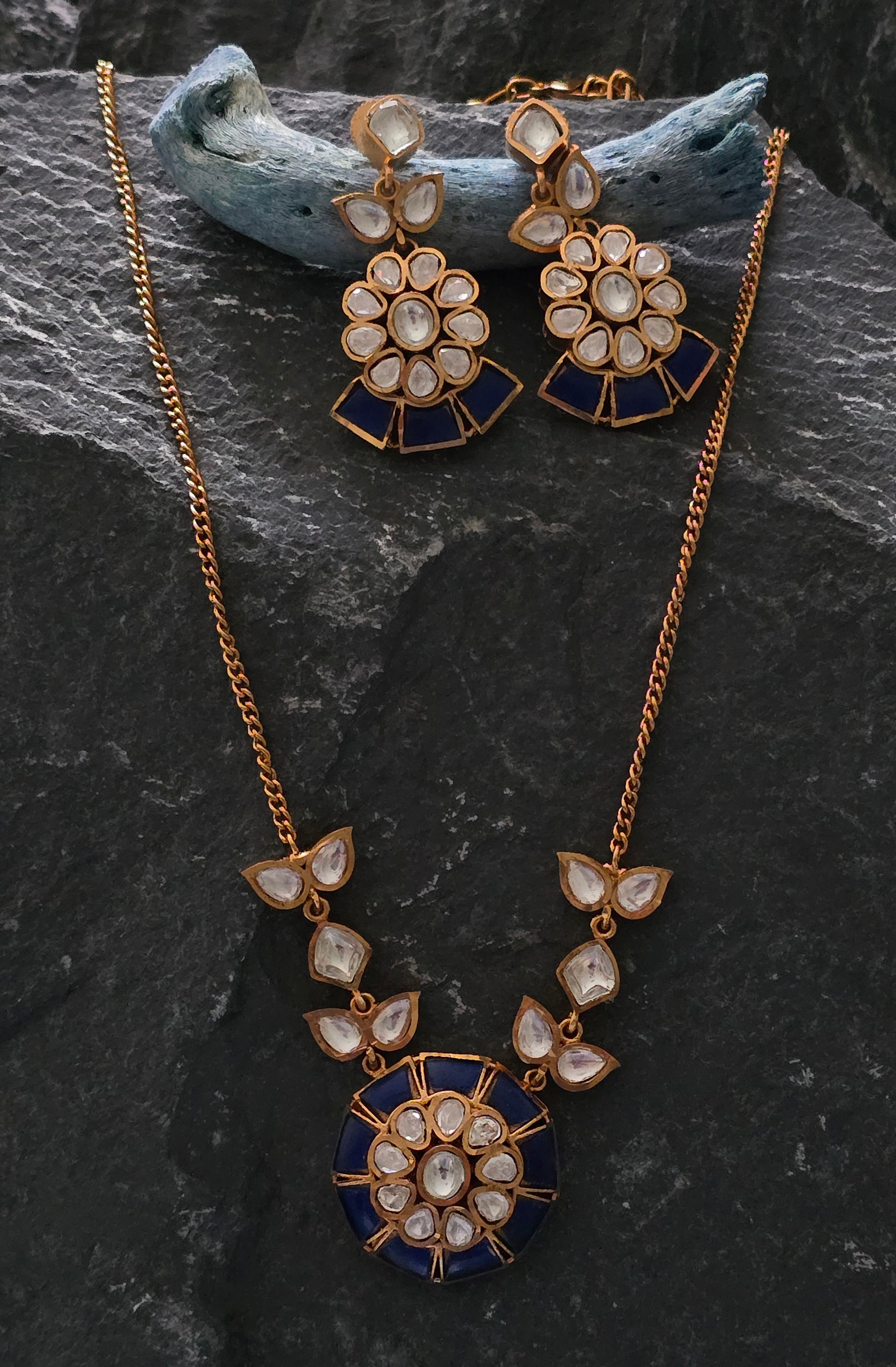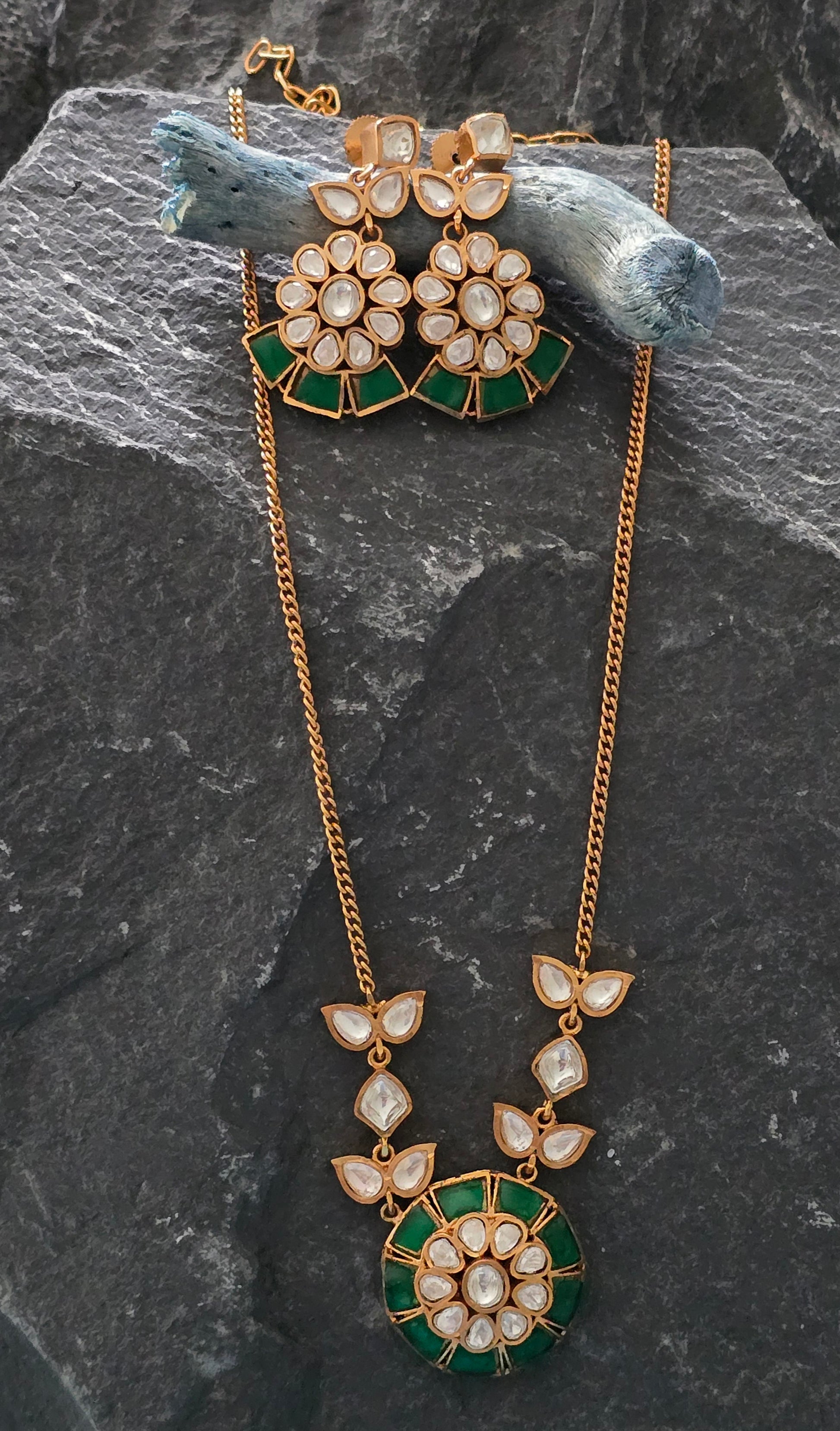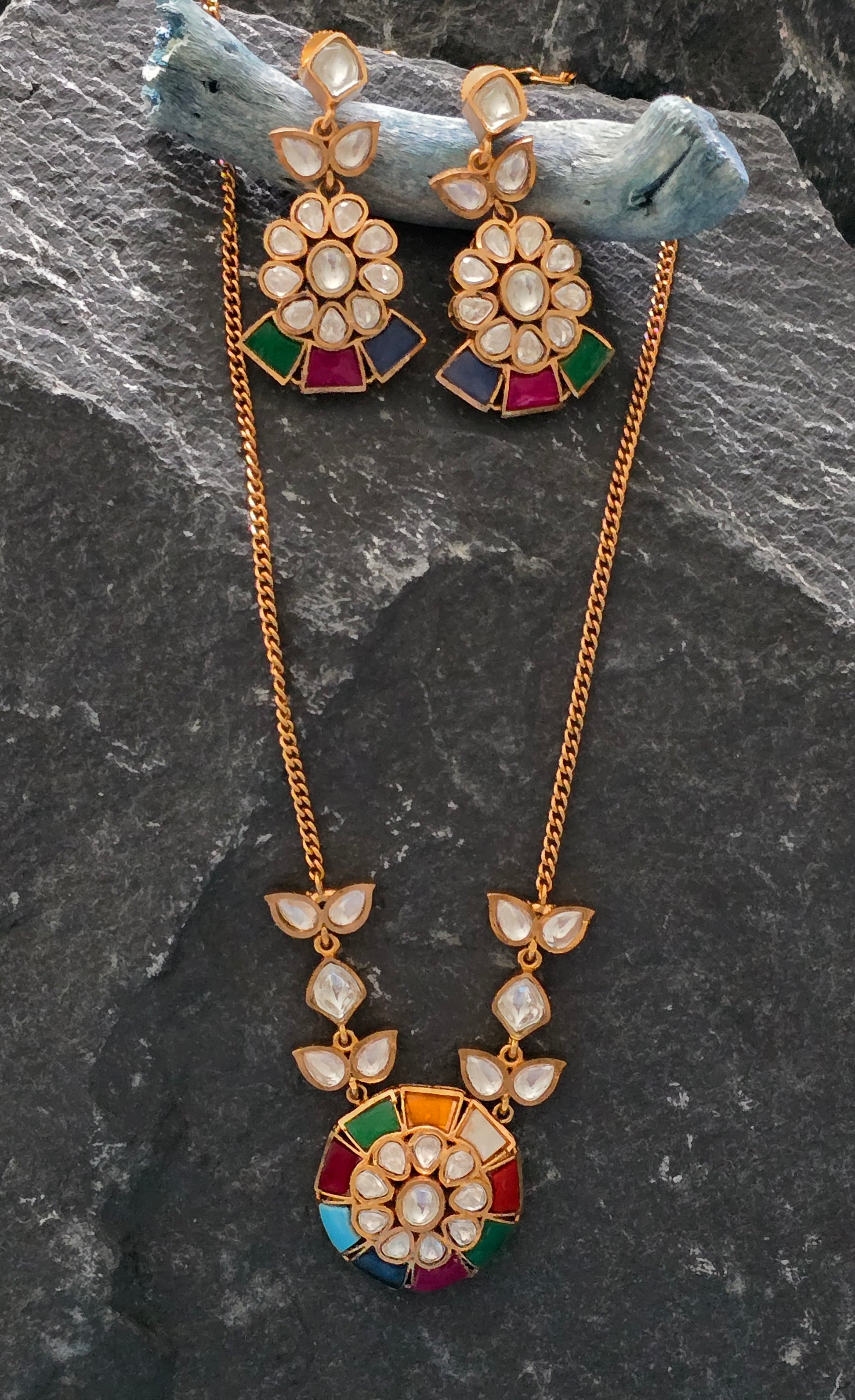 The Everley Moissanite Pendant Set is a stunning fusion of traditional artistry and modern elegance. This exquisite set features a sparkling Moissanite pendant adorned with intricate Meena work, showcasing detailed enamel craftsmanship that adds a touch of cultural charm. Accompanied by matching earrings, the set offers a harmonious and sophisticated look.