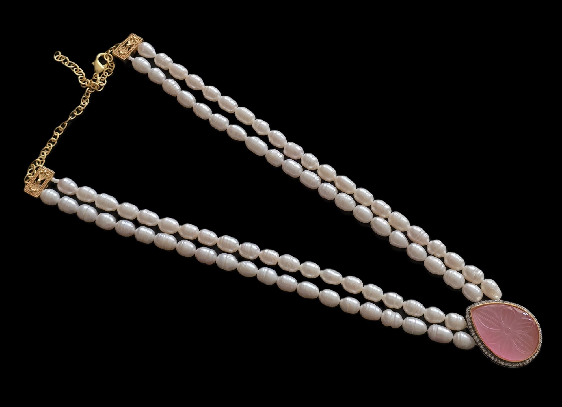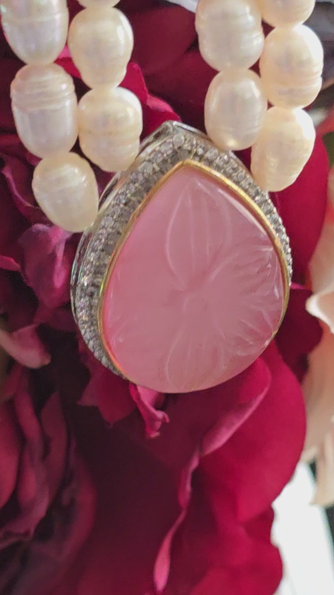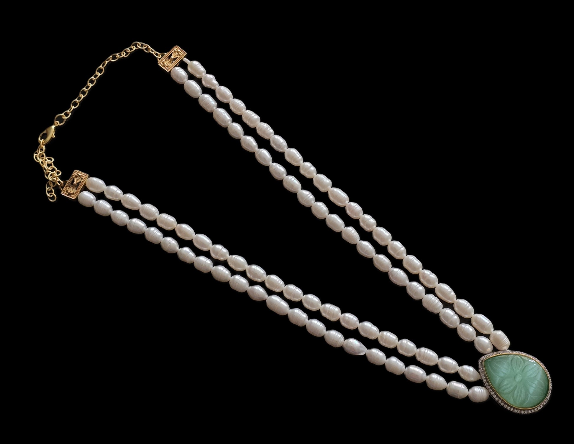 At the centre of the necklace sits a carved stone pendant, adding a touch of artisanal elegance and a pop of colour to the piece. The combination of pearls and carved stone creates a harmonious balance between classic sophistication and contemporary flair.