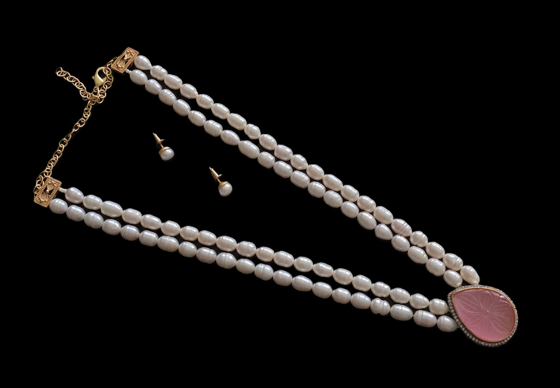 Complemented by matching pearl stud earrings, this set offers a cohesive and polished look suitable for various occasions, from formal events to everyday wear.