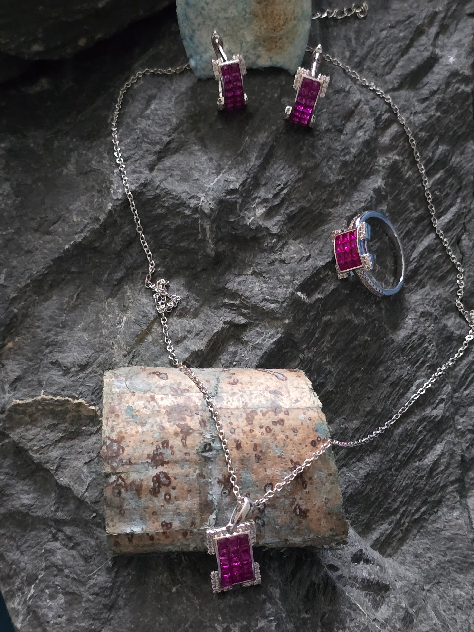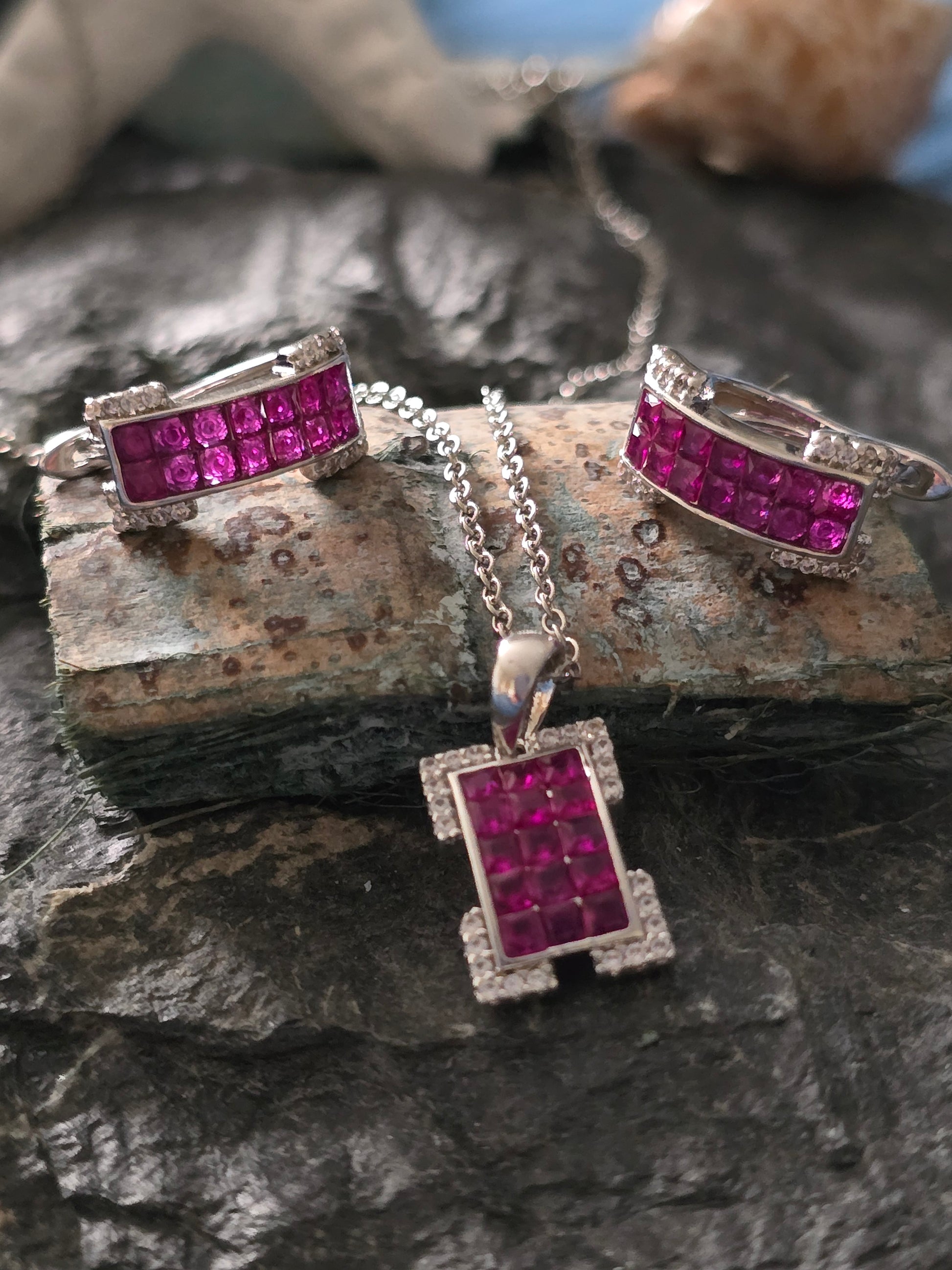 The Robyn Invisible Pave Setting Pendant Set is a masterpiece of modern elegance and craftsmanship. Featuring an intricate invisible pave setting, this set includes a dazzling pendant, matching hoops, and a ring, all adorned with meticulously set sparkling stones. The seamless design highlights the brilliance of each stone, creating a sophisticated and cohesive look.