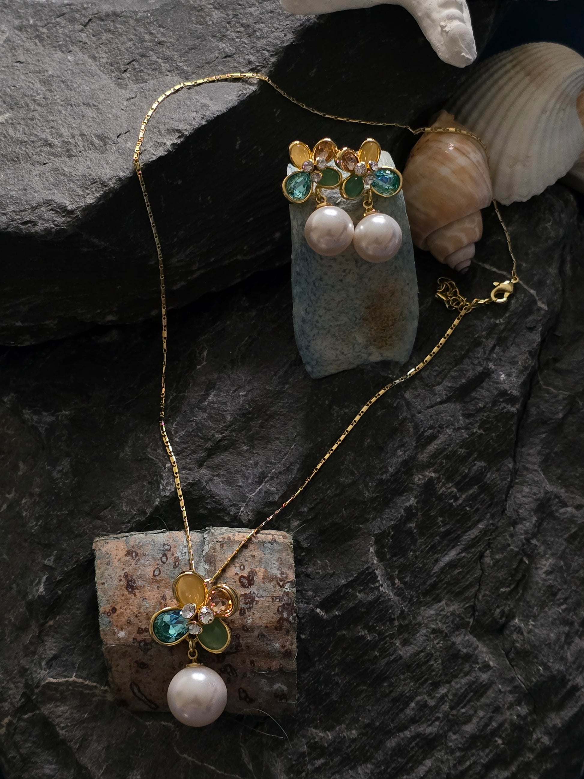 The Sienna Fusion Pendant Set is a stunning blend of elegance and artistry, featuring a brilliant crystals surrounded by natural stones and cubic zirconia (CZ), with a delicate hanging pearl drop for added sophistication. This exquisite pendant is complemented by matching earrings, creating a harmonious and stylish ensemble. Perfect for special occasions or adding a touch of glamour to everyday wear, the Sienna set enhances any outfit with its luxurious sparkle and refined design.